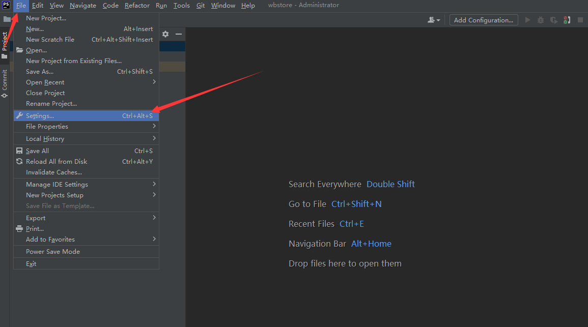 首先我們找到頂部菜單項 File 選擇然后選擇 Settings 項或者使用快捷鍵 Ctrl+Alt+S 打開